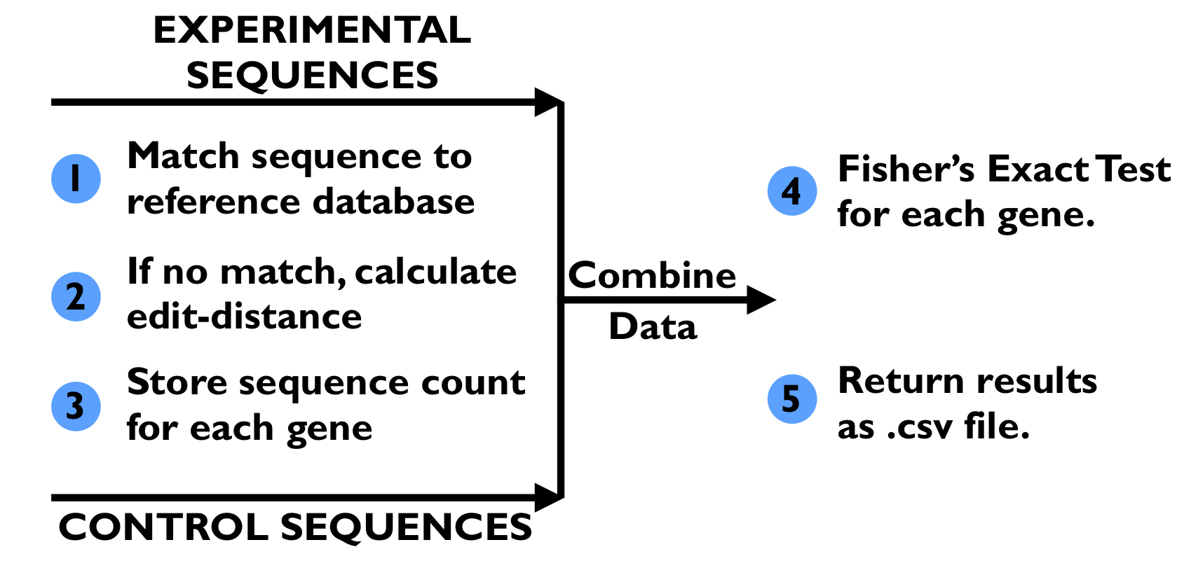 Shown above, the existing pipeline (1) takes in a control file and experiment file generated from the DNA sequencing step of the genetic screen. It also takes in a file containing the “database” of 80,000 gold-standard sequences. First, every DNA sequence in the control file is mapped to one of the gold-standard sequences; if the sequence matches one of the gold-standard sequences, then the match count for gold-standard sequence is incremented and the match count for corresponding gene is incremented. If no perfect match can be determined, then the edit distance between the control DNA sequence and every gold-standard sequence is calculated. The gold-standard DNA sequence with the lowest edit distance is found, and its match count and the match count for the corresponding gene are incremented. Once all the DNA sequences in the control file have been matched, this process is repeated for the experimental file. The match counts for genes in the control file and the experiment file are aggregated, and a Fisher’s exact test is run on the match counts from both files to determine if there is a significant change in the number of matched sequences for each gene in the experimental file when compared to the control file. The output of the pipeline consists of, for each gene, its Fisher’s exact test p-value, the number of matching sequences in the control file, the total number of sequences in the control file, the number of matching sequences in the experimental file, and the total number of sequences in the experimental file. These stats are written to a CSV file.